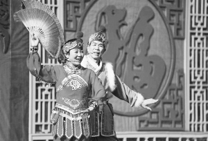 在内蒙古呼和浩特市大盛魁文化创意园,民间艺人在表演“二人台”《挂红灯》。 王正摄
