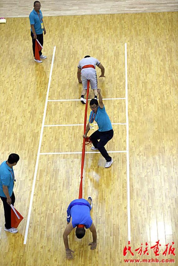 裁判员要紧紧盯着左右移动的坠条。第七届全国少数民族传统体育运动会上的押加比赛