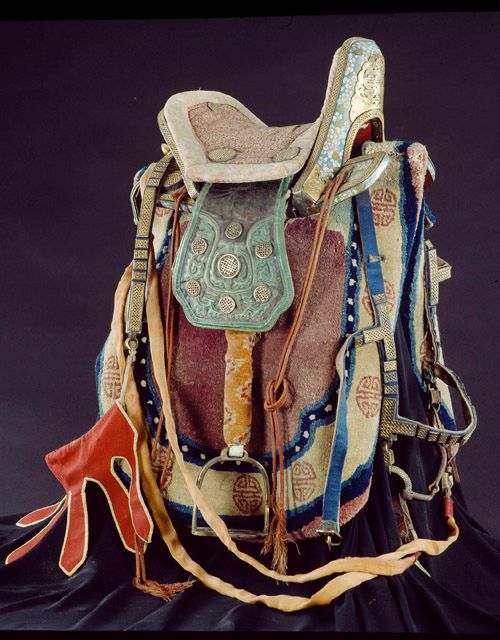 木胎,鞍桥及鞍翅包珐琅彩银饰。后鞍桥为较宽而平缓的大尾式,适用于长途跋涉。缰绳部分为黄丝带,属清廷赏赐的御用“紫疆”。此马鞍做工及用料考究,系清代蒙古王公所用之物。