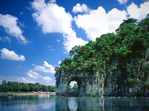 象鼻山,海拔200米,高出江面55米,长108米,宽100米,山体面积1.3公顷。由3.6亿年前海底沉积的纯石灰岩组成,酷似一头巨象伸长鼻子吸饮江水。象鼻山原名漓山,又名宜山、仪山、沉水山,简称象山。象山以神奇著称。其神奇,首先是形神毕似,其次是在鼻腿之间造就一轮临水皓月,构成“象山水月”奇景。因此,象山成了桂林山水的代表、桂林城的象征,桂林乃至广西地方产品多以象山作为标记。