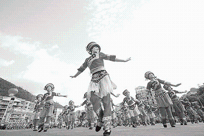 “摆手舞”是土家族最具民族特色的舞蹈,重庆市为了保护和弘扬这一独具特色的地方民族舞蹈,命名酉阳土家族苗族自治县为“摆手舞之乡”。,酉阳县十多年来坚持推广普及土家“摆手舞”。目前,这个县土家“摆手舞”普及率达八成以上,覆盖面达百分之百。2010年10月3日,在酉阳中国土家摆手舞欢乐文化节上,来自酉阳县的十万名干部群众以桃花源广场为中心、分布于桃花源大道和39个乡镇,同跳土家摆手舞,再现了诗中“红灯万盏人千叠”的盛况。经大世界吉尼斯纪录总部专家现场鉴定,酉阳十万人同跳摆手舞成功入选吉尼斯世界纪录2008年6月7日,酉阳摆手舞入选第一批国家级非物质文化遗产扩展项目名录。