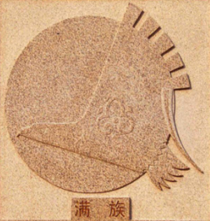升腾的红日与搏击长空的白色海东青,表现出满族英勇刚健的民族性格和昂扬向上的民族精神,也象征蒸蒸日上的光明前景。