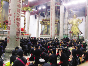 农历正月初四,在寒拾殿前举行新年迎财神祈福法会。