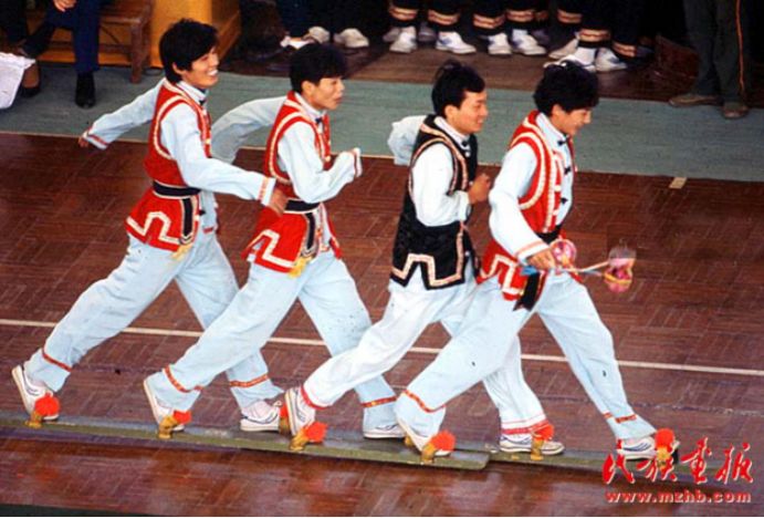 在第八届全国少数民族传统体育运动会之前,板鞋竞走是表演项目,图为