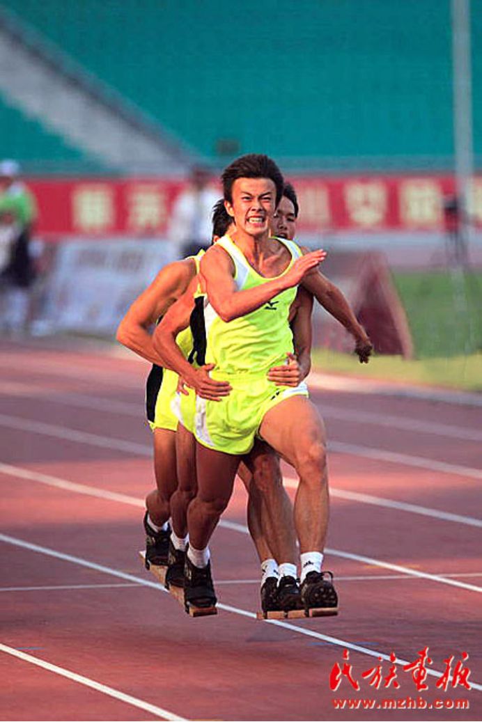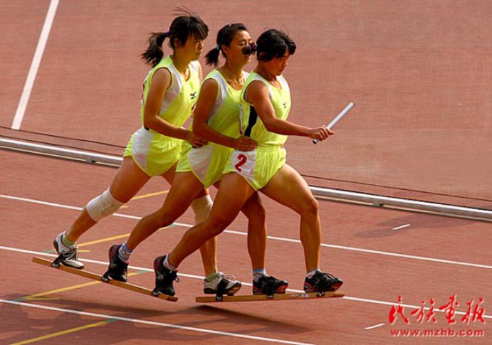 板鞋竞速讲究三名运动员的动作协调