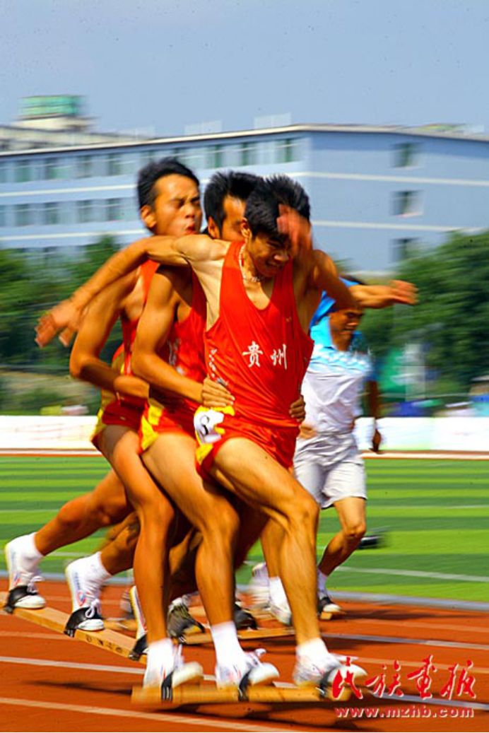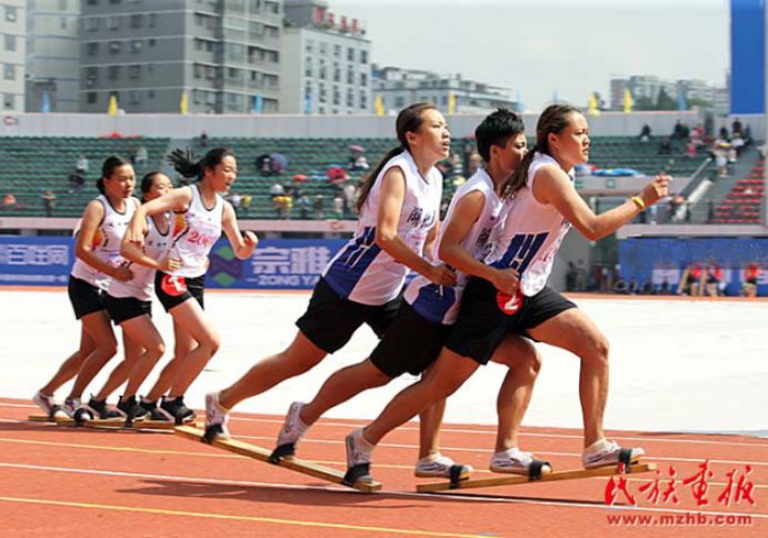 齐心协力 图为第八届全国少数民族传统体育运动会男子100米板鞋竞速