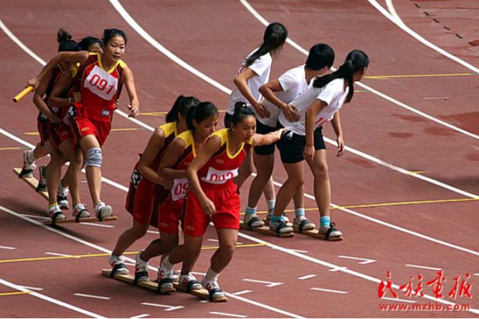 4×100米板鞋竞速接力赛竞争激烈,第十届全国少数民族传统体育运动会上的女子接力赛