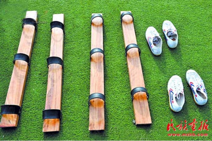 板鞋的板为全实木,它长为100厘米、宽为9厘米、厚为3厘米,而板上的护皮均是胶皮,由参赛队自备,但要求护皮宽度为5厘米,而护皮孔径的大小,根据比赛运动员的脚大小自己掌握。比赛时,主办方只提供标准的板,而上面的护皮,由参赛队自己根据规定安装。