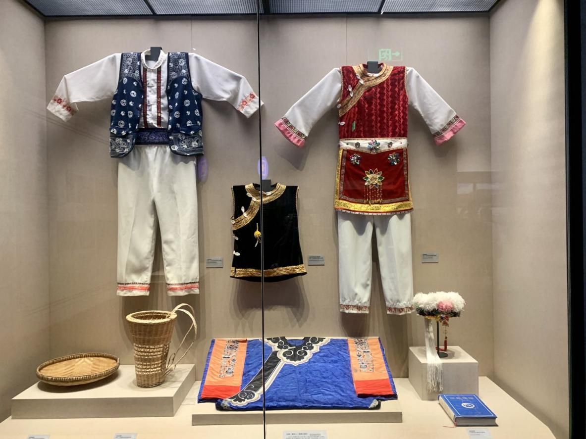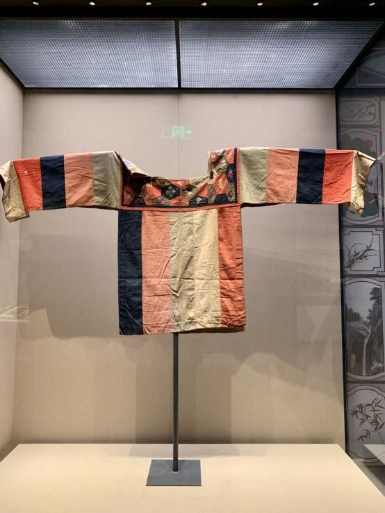 白族(南京人)“白素衣”:1955年4月征集于大定(大方)青山。“白素衣”是娘家在女儿婚前准备的专供婚、丧之用的衣服,分为彩色和白色两面。彩面用于婚事,用红、黄、青、黑、白等色绸布,剪成方形和三角形等若干同等小块,按纵横规律拼缀成方领口的五彩斑衣,领口、襟边、胸前和背心绣各有花纹。白色面用于丧事,用白色绸布制成,整个丧礼过程,妇女均穿“白素衣”。
