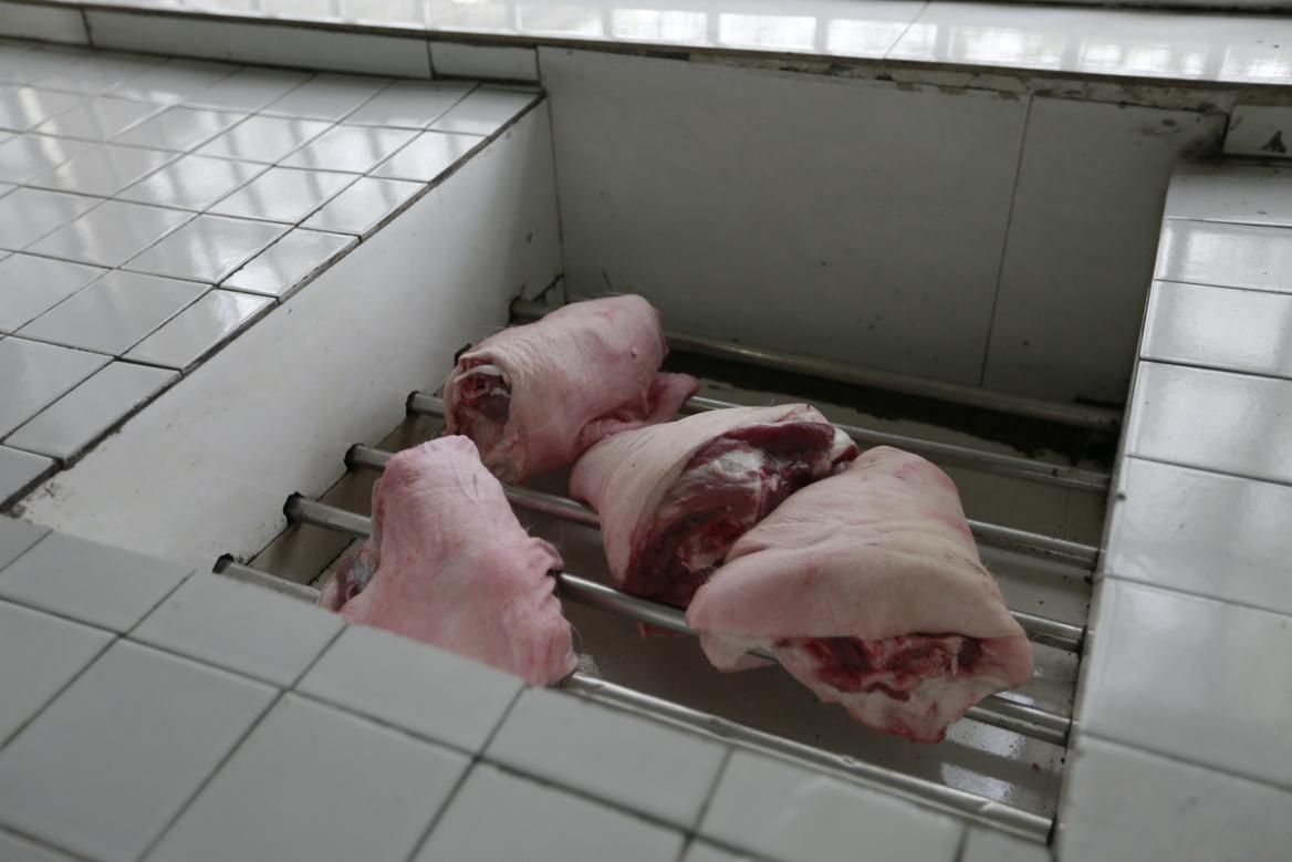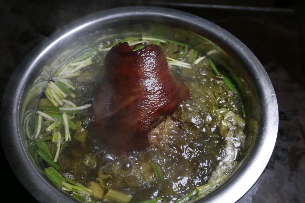将新鲜的猪蹄膀用火将毛烧掉。烧至面呈焦黑状,用水洗净, 用刀将蹄膀面刮干净,刮至其呈白色肉皮状,再用水清洗,放入锅内开水煮半个时辰后取出。