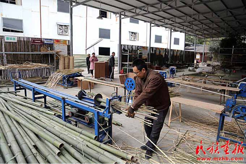 擂鼓镇扶贫车间,2018年出口创汇100多万元。图为开条机将竹子变成竹条