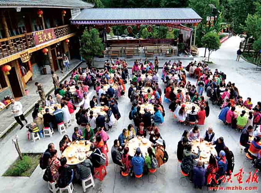 在通口镇井泉村神木寨,记者遇上寨子里正在接待一个旅游团,从热情的进寨挂羌红(羌族送给尊贵客人的红布或红绸带)、喝进寨酒、品尝当地美食到晚上的篝火晚会、跳起欢快的莎朗(羌族舞蹈),好不热闹!回乡创业开起农家客栈的李连秀告诉记者:“我想把外面先进的生活方式和老家的绿水青山、民族文化和优良传统结合起来,如今效果还不错。”“全镇2018年旅游接待人数为4万人,旺季还会出现客房不足的情况,镇上正在新建客房。”通口镇党委副书记胥杨告诉记者。