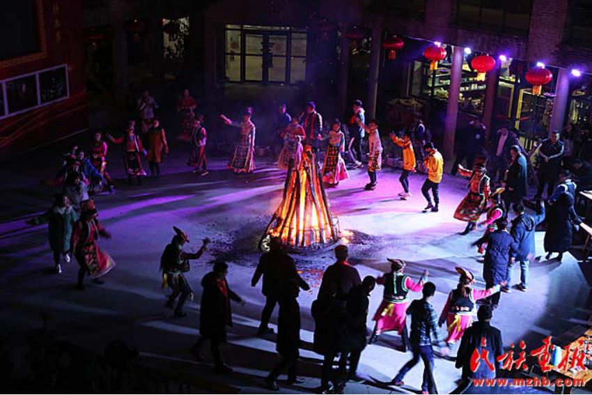 夜幕降临,当地群众和游客围着篝火,跳起莎朗