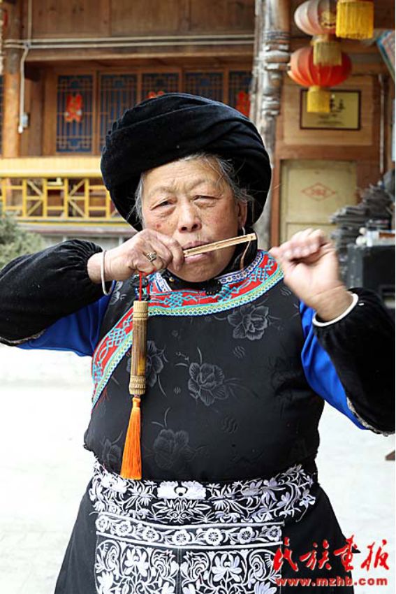 74岁的羌族口弦代表性传承人王泽兰正在表演口弦