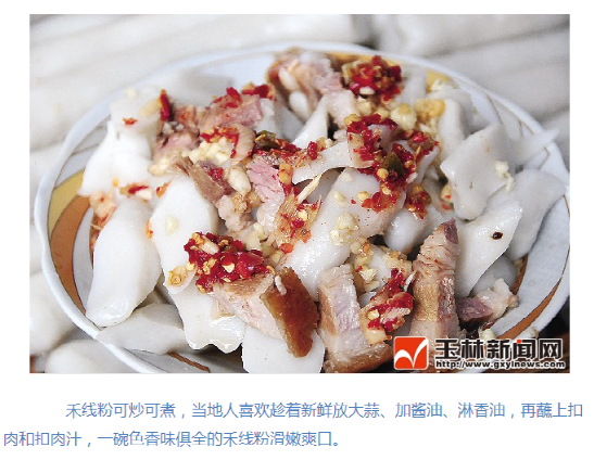 “是啊,我们这里的禾线粉都是作成狗腿骨状的,这样方便携带。”苏十妹边说边拿起一把锃亮的剪刀,拿起一根禾线粉飞快地 “咔咔咔”,一根禾线粉就被剪成拇指大小的几段,接着她“当当当”将扣肉切碎,一把捋进海碗,再放大蒜、加酱油、淋香油。一碗色香味俱全的禾线粉端了上来。记者像当地人一样用牙签挑了一段禾线粉,蘸点扣肉汁,滑嫩的禾线粉滑入嘴里,很有嚼头,味道像粉利,却又比粉利软、脆、爽,米的清香更浓郁。我们不知不觉就吃撑了。