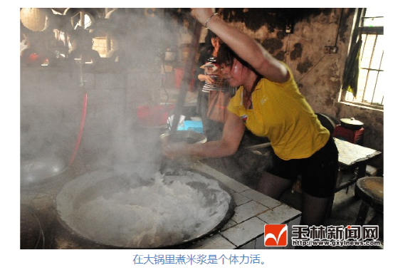 半个小时之后,冯五妹把米捞起来,开始打浆。冯五妹说,以前是用石磨来磨浆的,一天磨近百斤米,非常需要体力,现在有了打浆机省了一点事,但是除这道工序之外,其它的工序必须是手工制作,机器替代不了。说话间,10多公斤的米浆打好了。冯五妹开始给灶里添木柴将一口大铁锅烧热,撒一点花生油抹匀锅底,就把米浆倒进去,边给木柴添火边用一个长长的大大锅铲搅拌大锅里的米浆,随着米浆渐渐煮稠,搅拌也越来越困难,冯五妹早已满头大汗,小宋忍不住想去帮忙,但发现,根本就搅不动,这活太要力气了。