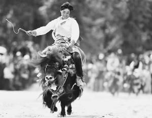 西藏牧民在传统赛牦牛比赛中。 新华社记者 普布扎西摄
