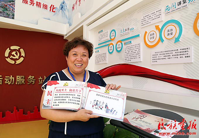 共享社区党总支书记刘丽娟展示社区居民绘制的《图说社会主义价值观》