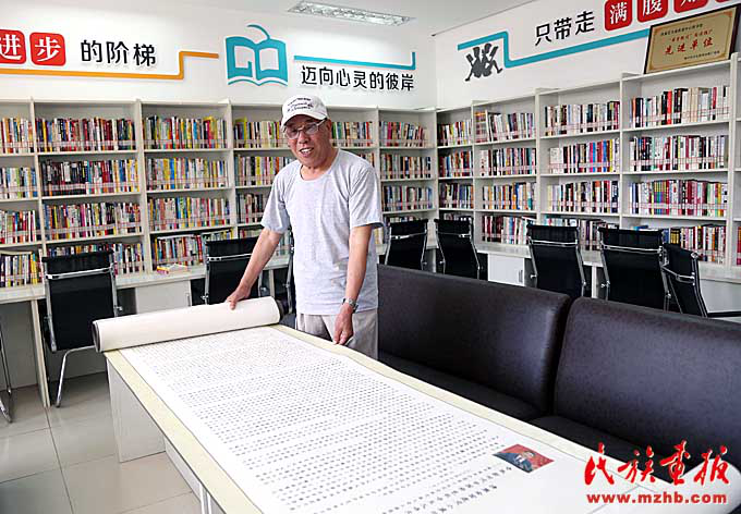 在社区图书室,78岁的老人王忠展开了一幅20米的长卷,这是用小楷抄写的十九大报告。刘丽娟还记得十九大开幕那天,组织居民观看,王忠老人越听越激动,就想把报告抄下来。这个想法得到了社区的大力支持。社区给老人准备好笔墨纸砚,这位入党53年的老党员,怀着对党的无比忠诚,足足花了两个月抄完了报告。“展示那天,我们把地拖了好几遍,大家围着长卷看来看去,都很激动,一个劲儿给老人鼓掌。”刘丽娟说。