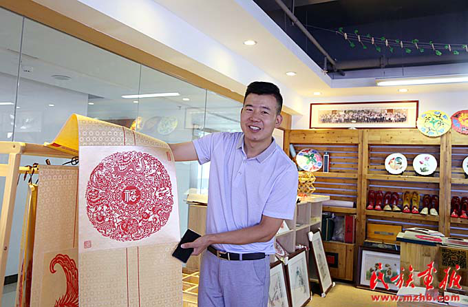 郭海介绍公司开发的文创产品“丝绸卷轴剪纸条幅”