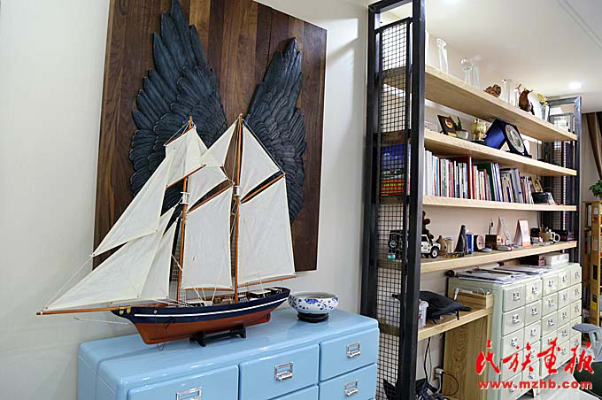 帆船与“展翅”雕塑相互映衬着,寄托着王振和的人生理想