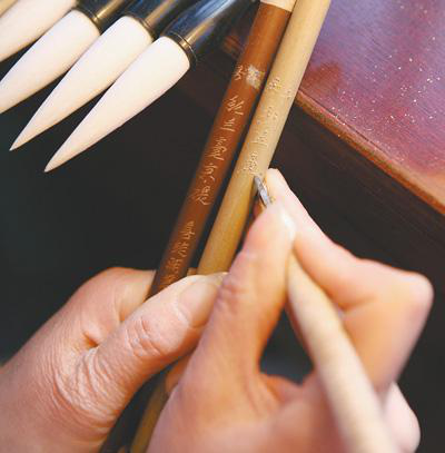 刻字是目前唯一可以用机器来代替的制笔工序。在笔杆上刻上笔的商品名和生产单位字样,古时,还要将产品名刻在笔杆上,例如:50两兰蕊,意即100支兰蕊毛笔售价为50两白银。当时是不允许小贩随便加价的。