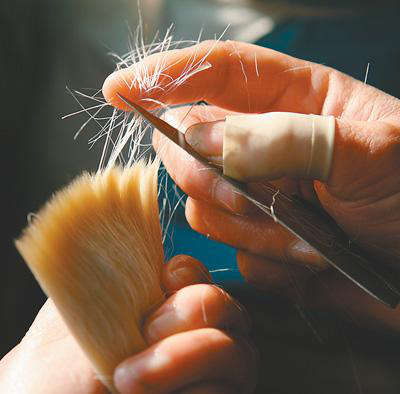 制笔业有句行话:“笔之所贵在于毫。”唐代诗人白居易在《笔诗》中对毛笔制作的精练堪称“千万毛中拣一毫”。