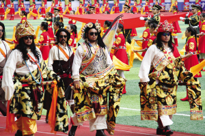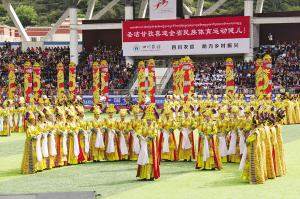 英雄史诗《格萨尔王》是世界上最长的史诗,甘孜州是格萨尔王的故里,也是史诗的发祥地。在本届运动会开幕式上,来自甘孜州职业技术学校、色达县代表队的演员们,用威武雄壮的表演,在这个安宁、祥和的时代再一次唱响史诗的旋律。人们高兴地看到,格萨尔王用一生追寻的和谐、幸福和安康的世界已经来临。