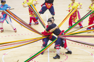 600名演员形成了一个大圈,象征着中华民族大家庭;大圈之中是6个小圈,象征着各民族在祖国的怀抱中幸福生活。各民族在小圈里展演着本民族的民间体育项目:彝族的摩尔秋旋转起来了,羌族的推杆正在角力,藏族的格吞、摔跤也相互较量着。各民族传统民间体育项目让世界变得多姿多彩。