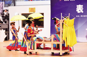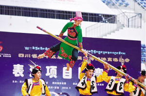 攀枝花市的项目《板凳龙》,挖掘了彝族人不仅崇尚“火”,而且也崇拜“龙”的独特文化。参赛队员将民间传统“板凳龙”进行了改编,由2名男子舞动一条龙,最后10条小龙组合成为一条大龙,体现出彪悍奔放和跃跃欲试的竞技动作,展示出彝族青年男子热情奔放的豪情。