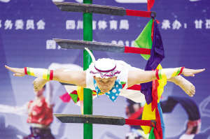 甘孜州的项目《嘎久》展示了藏族人民节日聚会时的一种竞技体育活动。嘎久,藏语意为“翻越马鞍或吉祥翻越”,选手以前手翻姿势翻越马鞍,或穿藏装钻圈到终点,速度快者获胜。比赛充分体现了民族传统体育的灵活性、趣味性和技巧性。