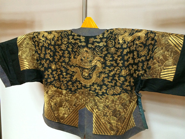 江南三织造是专门负责织造清代帝后各式服饰及赏赐、贸易等绸缎的机构。其中江宁织造局主要生产云锦,其花纹艳丽多彩,宛如云霞,其妆花织物工艺繁复、华丽美观;杭州织造局织造绸、绫、罗等织物;而苏州织造局主要生产织锦、缎、纱、绸、绢等。从织造的技艺和服饰图案、色泽看,民族文化宫博物馆所藏石青色缎金丝织锦龙褂应属江南三织造织制。