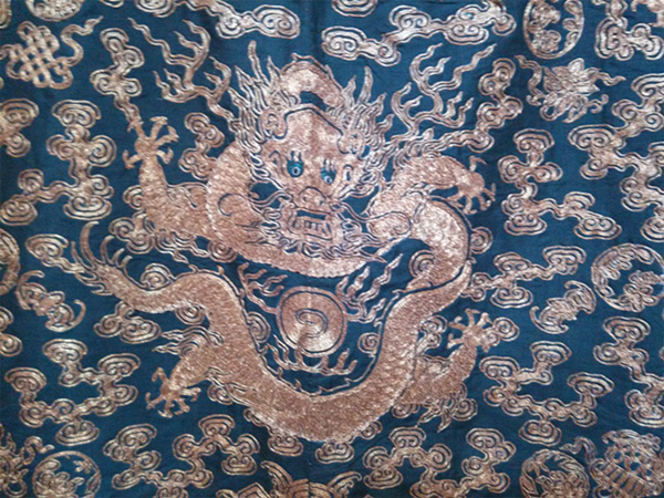 在我国历史的封建礼制中,服饰上的龙图案形象主要为帝王、君王所用。从商周传下来的衮服,一直到最后一个封建王朝清代末年,龙纹依然为帝王所专用。龙,在服饰图纹中长期占据着最高位置。根据龙的形状,有团龙、行龙、大龙等三种,不同的龙形,在服装上各具特定的象征意义,表现出端庄严谨、昂扬矫健、气势宏大的气质。