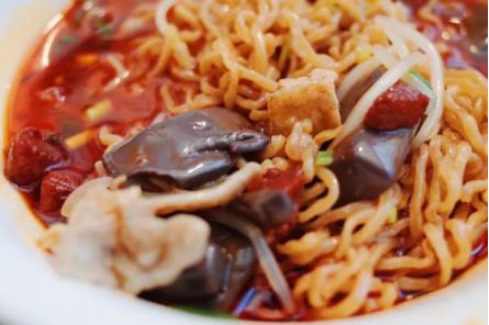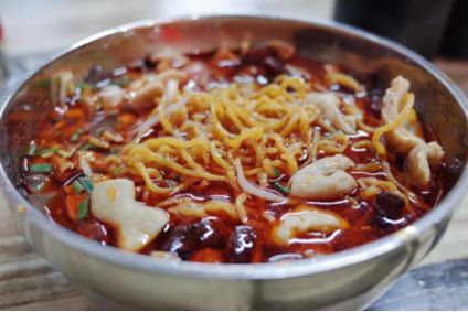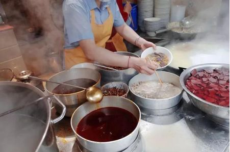 不过配料和调料却有20多种,制作非常讲究,用以鸡蛋面、猪肠、血旺、脆哨四大原料为本,再调放鸡汤、红油辣椒等佐料,经多道工序,才出成品一份。