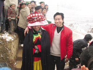 新娘依然穿戴着彝家传统服饰,而新郎则穿着一件红色休闲外套