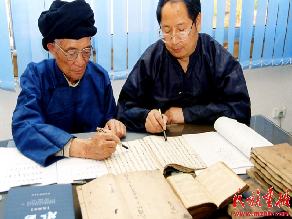 韦章炳先生获得了黔南州首批非物质文化遗产传承人荣誉称号,图为第十三代水书传人韦光荣与韦章炳先生一起翻译水书