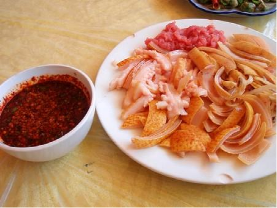 白族人民喜吃酸、冷、辣等口味,并善于腌制火腿、弓鱼、螺丝酱、油鸡枞、猪肝胙等各种味美可口的菜肴。大理等中心地区的白族人民,还喜吃一种别具风味的“生肉”(或称“生皮”),即将猪肉烤成半生半熟,再切成肉片或肉丝,佐以姜、葱、醋、辣椒,以宴请客人。此外,还有用糯米酿制的白酒,用苍山雪炖梅和糖制成的“雪梅”,邓川特制“乳扇”、“乳饼”等也都十分可口。
