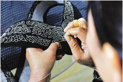 第四步是刺绣,包括三个环节,即固定框架图案、填芯和镶边。固定框架图案,即用一根大针将马尾线穿好,再用另一根稍小的针穿上同色丝线,然后一边用马尾线在布面上镶成各种图案,一边用穿有丝线的小针将图案固定在布面上。填芯,即用各色丝线将固定好的图案空隙部分填满。镶边,即用橙色和黑绿色丝线在四周挑绣成镶边图案。