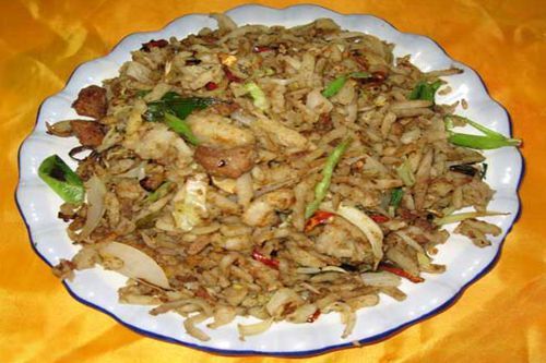 洋芋擦擦是用不起眼的土豆做成的,色泽金黄的土豆泛着淡淡的油光,土豆的清香洋溢开来,吃上一口,既有薯条的口感和嚼头,又有肉末红椒的鲜香。这是用土豆裹荞麦粉蒸了后再炒出来的美味,遵循了西北菜少油不少的风格。洋芋擦擦,顾名思义,是用土豆做的。制作原料和程序都很简单,它是将土豆切成稍粗的丝,再拌以干面粉,使每一根丝上都均匀地裹上一层面衣,然后上屉蒸熟。食用时,盛入大碗,调入蒜泥、辣面、酱、醋、葱油或香油,在拌上自制的西红柿酱。若用炒锅快火炒出,其味更佳。洋芋擦擦属天然绿色食品,一年四季均可食用。
