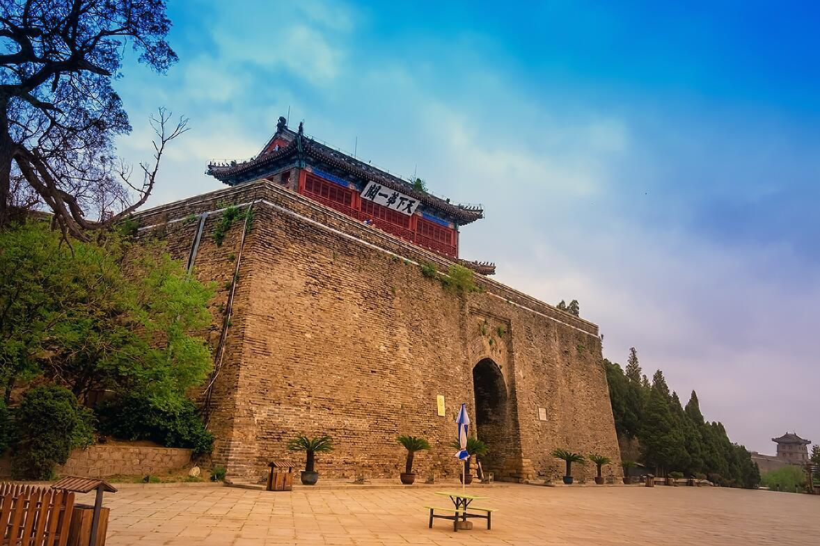 山海关关城始建于明洪武十四年(1381年),是山海关长城的中心,呈不规则梯形,西北和西南转角处呈圆弧形,未设角台。关城城垣周长4727米,城高14米,厚7米。东墙为长城主线,关城东西南北四面各建有四座城门,东门为“镇东门”,即“天下第一关”,西门为“迎恩门”,南门为“望洋门”,北门为“威远门”,四门城台上均建有城门楼。