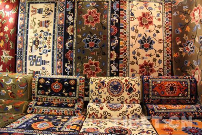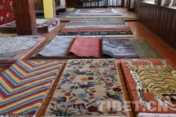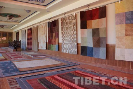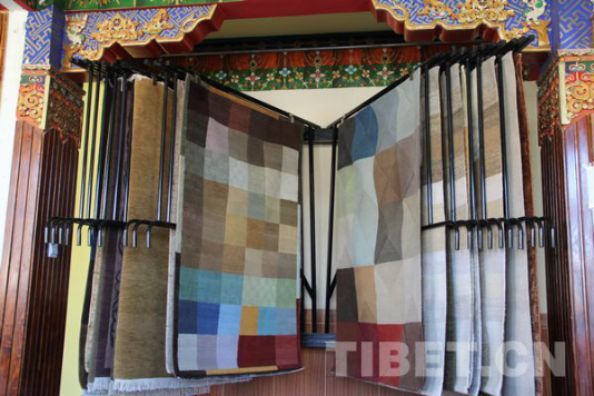 西藏帮锦梅朵工贸有限公司的藏毯展厅里陈列着样式时尚、色彩多样的藏毯。