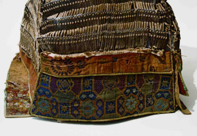 现藏于民族文化宫博物馆的这套萨迦法王盔甲是元代元世祖忽必烈赐予西藏萨迦法王八思巴的物品,为古代军用防护装具,该盔甲由头盔和身甲两部分组成。头盔盔体较高,直径23.5厘米,后高40厘米,由6瓣弧形钢片卯榫焊接而成。头盔顶部设有中轴将钢片固定,中轴上方可插放羽翎;头盔下围由皮条串制的铁甲片和织锦缎护耳组成,用于护颈、护耳。身甲胸围112厘米,长80厘米,通体用皮条将1000多片铁甲片穿编、连缀而成,甲片横向为左片压右片,纵向均为下排压上排。身甲形制为上窄下宽,两臂领口处留空,呈背心状,自上而下横向由十圈甲片连接而成,即甲身10属。下围由宽边丝织锦物制成,织锦以黄、红、蓝、绿为基色,上绣牡丹、菊、云纹、宝相花等纹样。