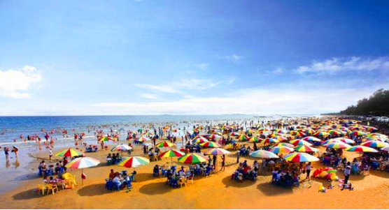 金滩,位于京族三岛中的 万尾岛南边,海岸线长15公里,与越南著名的风景名胜区万柱岛隔海相望。这里沙细、水清、坡缓、浪平,且无海藻、无鲨鱼、无污染,沙滩由海岸缓缓斜入海中,大海沙滩珠联璧合浑然天成,是中国沿海不可多得的集阳光、沙滩、海水于一体的天然海滨浴场。岸上20多公里长的郁郁葱葱的木麻黄防护林带,海风沙沙,海浪哗哗,荫可蔽日,晴可观花。金滩空气清新自然,负氧离子含量极高,年平均气温在21-23度之间,可谓“春秋相连,长夏无冬”,是康体休养的好地方。在这里,你可尽情惬意地拥抱大海——冲海浪、拉海网、耙海螺、捉海马、尝海鲜、拍海照、祭海神、唱海歌……大海与金滩,将给你无穷的快乐;金滩与大海,留给你一生的眷恋。